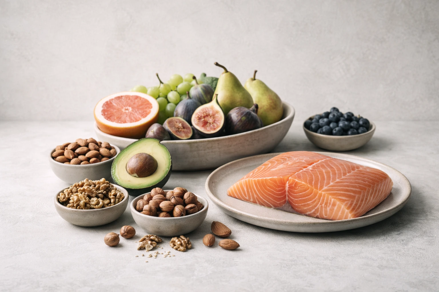 A clean, healthy food composition with fresh ingredients including raw salmon on a wooden board, green vegetables such as broccoli, avocado and green beans, bowls of seeds and nuts, blueberries, kiwi, olive oil and lemon, styled on a bright neutral background.