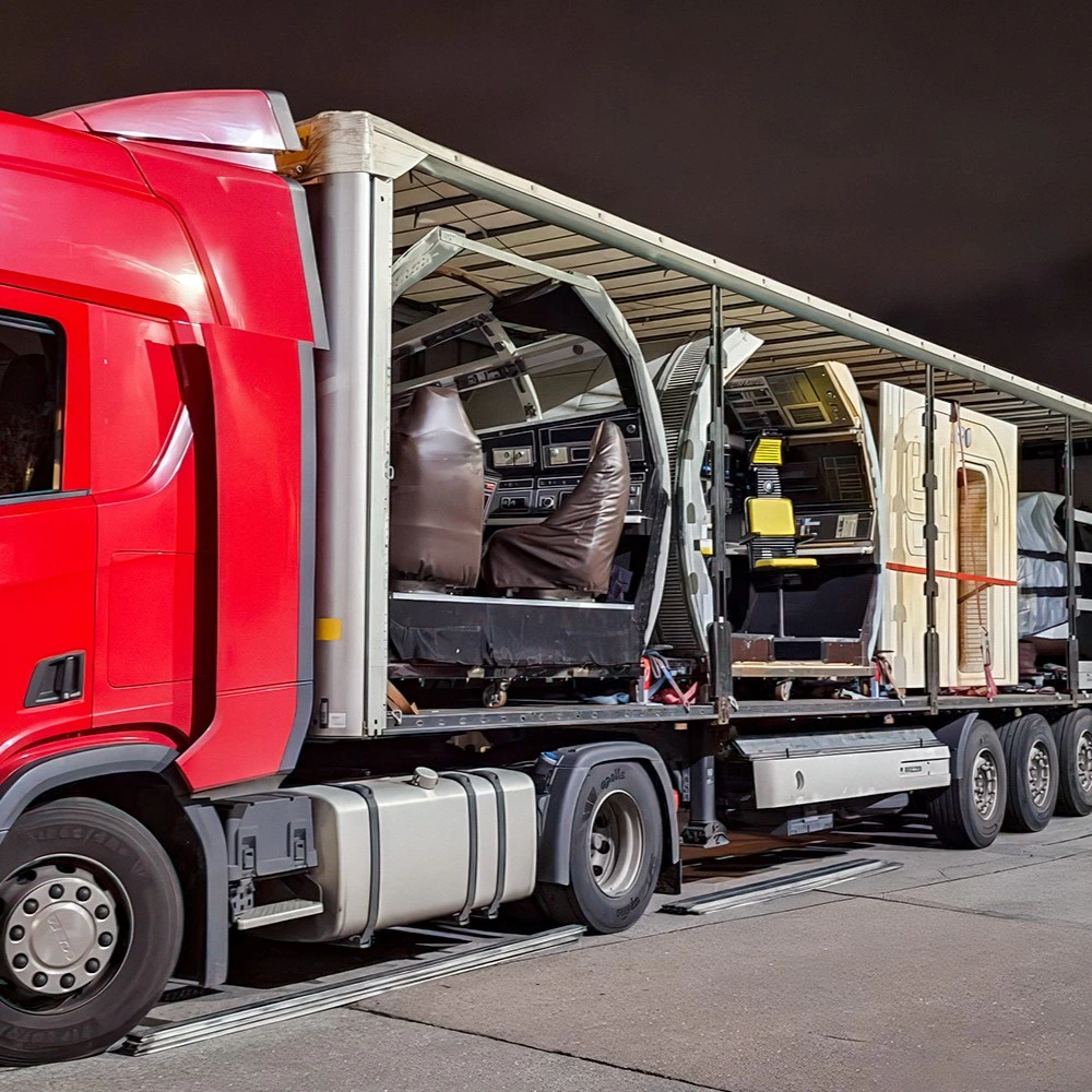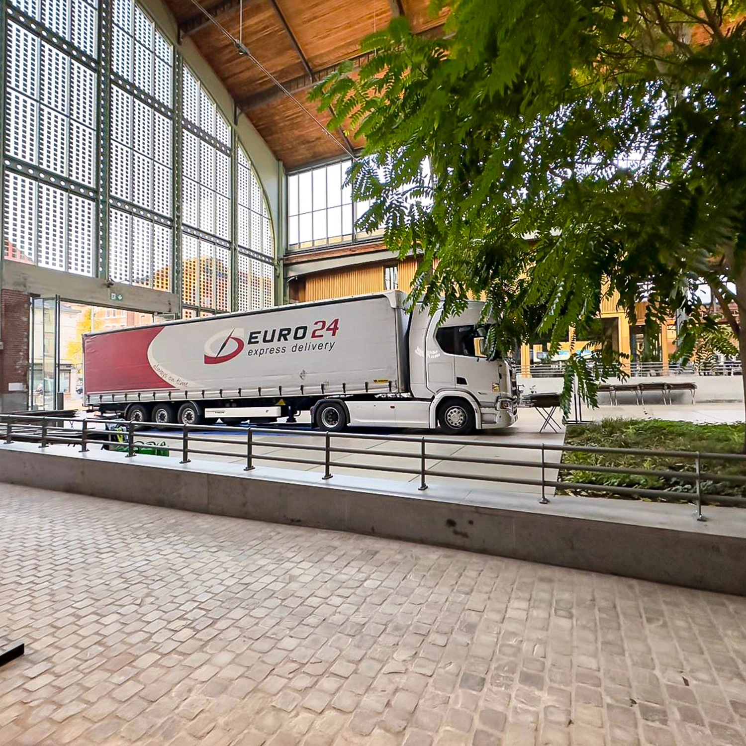 Utilizăm vehicule echipate cu platformă hidraulică, care permit încărcarea și descărcarea în siguranță a componentelor standului în locații unde echipamentele halei nu sunt disponibile. Este soluția ideală pentru livrări în condiții dificile sau în afara orelor standard de funcționare ale locației.